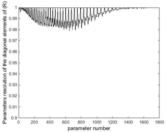 Figure 3 shows the diagonal elements of the resolution matrix R with respect to the parameter numbers of of the N–S gradient data at the best damping parameter (). It shows that the diagonal element of the resolution matrix approaches unity, which demonstrates the great description of the model for the data. The increase of R at higher orders could be interpreted in terms of the dominance of the noise at higher orders of expansion [27,33].