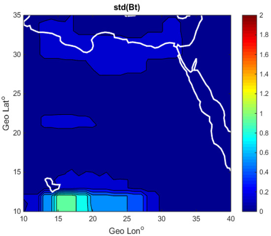 Figure 5 shows the standard deviation of the N–S gradient field components. The standard deviation data binned to regions of the surface area of 2.5 degrees. For each binned area, the standard deviation has been calculated as shown in Figure 5 for the component. It shows regions of higher standard deviation corresponding to large errors in the data. The same calculations have been performed for the other vector field components, , , and , respectively. According to Equation (4), each data point located within a specific binned region has been divided by its corresponding standard deviation. This process has been implemented by several users to reduce the effect of outlier points [34,35].