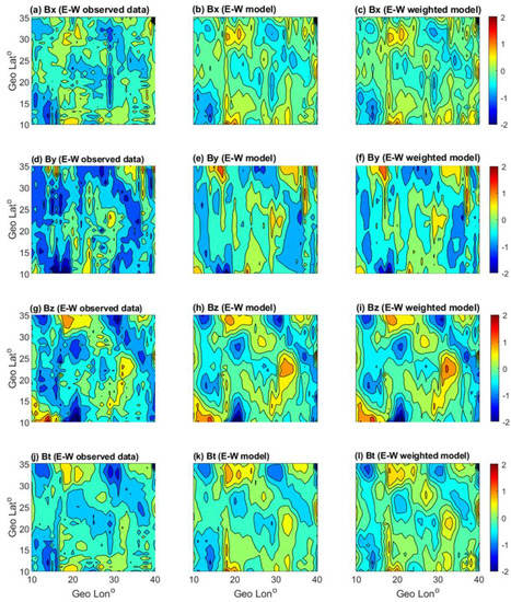 The , , and components of E–W direction for the observed, modeled, and weighted modeled.