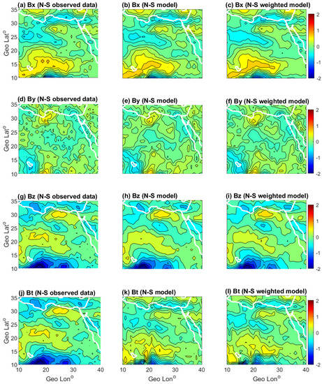 Figure 6 shows the E–W gradient data calculated from Swarm A and C. Rows from top to bottom correspond to the , , , and components, respectively. Columns from left to right correspond to observed, modeled, and weighted modeled gradient data, respectively. The observed and are noisier than and . The noise in the horizontal components ( and ) could be attributed to external sources. In addition, we can interpret it in terms of the sensitivity of the data sets onboard the Swarm A and Swarm C satellites. In order to reduce this noise, we have implemented the weighted damped least-squares technique as shown in the most right column of Figure 6. It is worth noting that the magnetic anomaly in the component was excluded from [27] because the non-gradient data are strongly affected by external and lithospheric activities (e.g., Earthquakes, ionospheric dynamos, etc.). However, using the gradient data is a powerful technique in removing external noise in comparison with [27], which is strongly affected by external ionospheric and magnetospheric noise. The weighted damping least-squares fit technique of the gradient data has the capability to emphasize a lithospheric magnetic anomaly in a much smoother form, especially in the and components. The weighted damped modeled data in the and components illustrated magnetic anomalies that could not clearly be seen in the observed gradient data in most left panels. The most clearly enhanced anomalies under the weighted damping technique are shown in the northwest and in the middle of the map of the component. The field strength of these regions is enhanced under the action of the damping technique in comparison with the observed lithospheric gradient data.