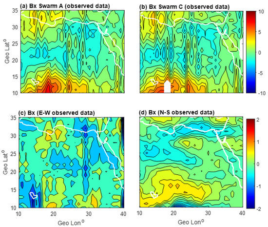 In order to emphasize the capability of the gradient technique in overcoming external noise, especially that which exists in the horizontal components (), we have conducted a comparison between the gradient data in the N–S and E–W directions, as shown in Figure 8c,d, respectively. Figure 8a,b clearly shows that the non-gradient data observed by Swarm A shows differences in comparison with the non-gradient data observed by Swarm C; in addition, both satellites have N–S strips. However, the satellites contain the same exact data sets; these differences could be interpreted in terms of the difference in environmental conditions surrounding the satellites because Swarm A and Swarm C are separated horizontally by 150 km distance in longitude. The N–S gradient data is less affected by this problem (different environmental conditions) because we have subtracted two points observed by the same satellite, so the mechanical and electronical noise, in addition to the environmental conditions, is canceled through the subtraction process. So, subtracting Swarm A and Swarm C magnetic data to obtain the E–W gradient resulted in noisy maps, in comparison with the N–S gradient data, as is clearly shown by comparing the images in Figure 8c,d.