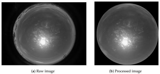 Since we are only interested in nighttime all-sky images between astronomical evening twilight and astronomical twilight, we compute the altitude of the Moon at a specific time given the longitude and latitude of the 3850 m site to filter the data set. Our image data does not include complex air-condition images, such as cloud images under rain and dew. The sky plane is projected as a circular region with a diameter of about 960 pixels. The pixels that are not sampling the sky must be removed, such as buildings, mountain ridges, and ground (as shown in Figure 2a). The masking technique is used to produce region of interest images (ROI) by setting the corresponding pixel values to zero. Each image is resized to 960 × 960 pixels (as illustrated in Figure 2b).