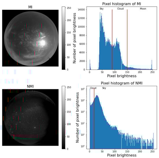 Clouds may appear brighter or darker than the clear night sky depending on the Moon’s illumination conditions. The comparison between a moonlight image (MI) and a moonless image (NMI) is shown in Figure 3. When the image contains moonlight (MI), the area of clouds is substantially brighter than the clear sky, and the Moon area has brightness characteristics similar to those produced by clouds. In a moonless image (NMI), on the other hand, clouds are darker than the clear sky, resulting in a sharp peak at the darkest end of the histogram of the pixel values. Thus, these two types of images show significantly different characteristics, which requires us to deal with them separately.
