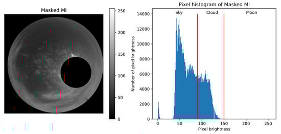 According to the Moon’s Cartesian coordinates, a circular mask of the Moon can be created automatically. It should be noted that since astronomical observations are not interested in the Moon region, we use a circular mask with a fixed radius regardless of the Moon phase. Figure 5 shows a masked MI and pixel histogram. We can see that the image histogram has an approximate single-peaked distribution with little difference in contrast between clouds and clear sky. However, the masked MI has some unmasked regions affected by moonlight (the right side of the histogram).