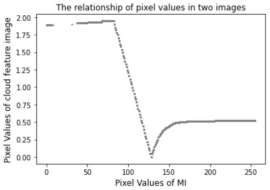Mapping of pixel values between two images. The horizontal axis represents the pixel values of the MI, and the vertical axis represents the pixel values of the cloud feature image.