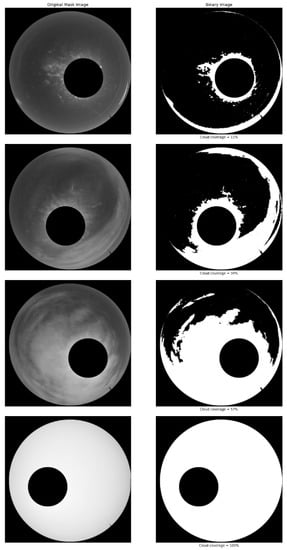 Following the application of the two described procedures for NMIs (direct Otsu method) and MIs (Otsu method on the cloud feature image), a segmentation map for each exposure image (with 0 indicating clear sky and 1 indicating the presence of clouds) is obtained. This segmentation map is used to derive the Cloud Cover Ratio []:
