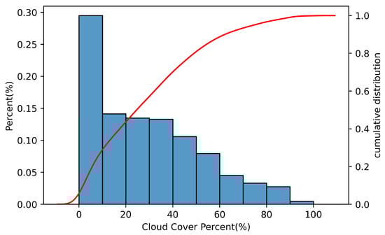 Our method is also used to analyze the fraction of clear sky at the 3850 m site. Figure 11 shows the cloud cover statistics of the 3850 m site. It is found that 81% of the images have a cloud coverage lower than 50% of the full sky; a cloud coverage lower than 33% of the full sky is 60% per year. In order to compare with the Lenghu site, we adopt the definition of photometric (cloud coverage ≤ 15%), Spectroscopic (12.5% < cloud coverage < 50%), and unusable (cloud coverage ≥ 50%) in Ref. [], which was used to analyze the fractional photometric time of the Thirty Meter Telescope and European Extremely Large Telescope sites [,]. The result shows that the fractional photometric time is 71% at the 3850 m site, which is basically identical to the results of the Lenghu site ([]).