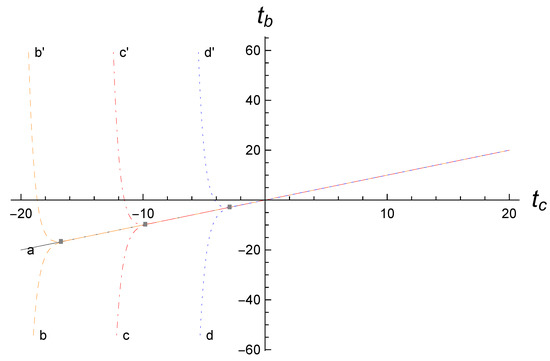 for . Then, the corresponding solutions for b and will be given by Equations (37) and (39) by simply replacing T by , that is,