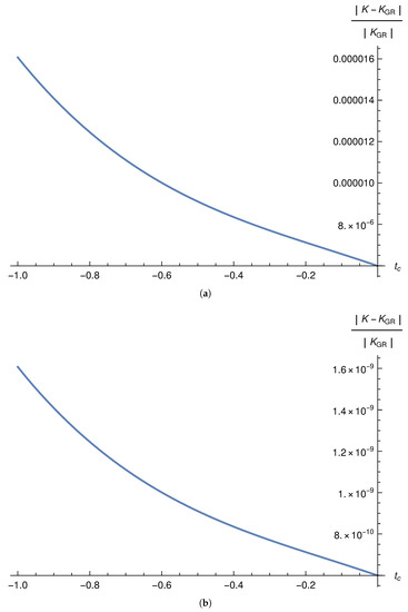 where is defined in Equation (60), which excludes the BMM choice [59], for which we always have , as shown explicitly by Equation (63). Despite the significant difference of the metrics of the AOS and BMM/GM models, we found that, to the leading order, the asymptotical behavior of the spacetime in the two models is universal and independent of the mass parameter m for the curvature invariants [cf. Equations (72) and (88)]. However, to the next leading order, they are different. In particular, the Kretschmann scalar behaves as: