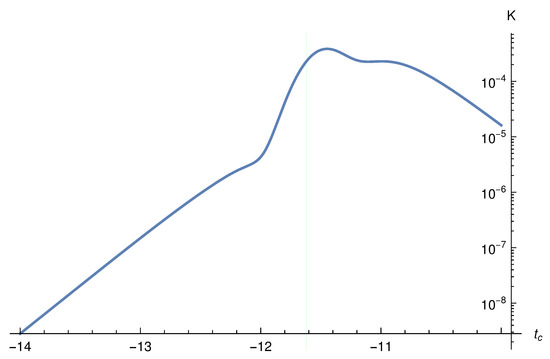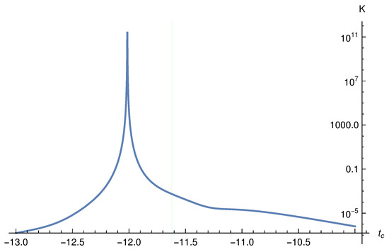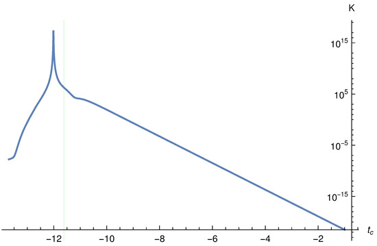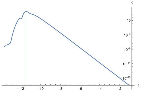 In this case, the explicit relation between and is given by Equation (114). This relation allows us to write down the metric and calculate the curvature invariants. Similar to the case, the exact expressions of them are too complicated to be written down explicitly here, and instead we find that it sufficient to simply plot them out. Since they all have similar behavior, we plot out only the Kretschmann scalar. In particular, we plot it for and , respectively in Figure 12 and Figure 13. The vertical line in each of these figures represents the location of the transition surface, and is usually different from the maximal point of the Kretschmann scalar, quite similar to the case and for similar reasons.