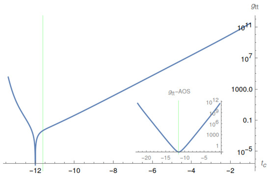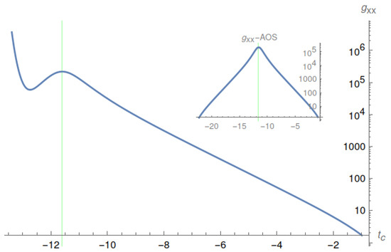 In particular, when , we have , as can be seen from Equation (102), where is defined by Equation (103). In Figure 9 we plot out the function for the same choices of the parameters as given in Figure 7, from which we can see that it changes dramatically near the maximal point of the Kretschmann scalar. In Figure 10 and Figure 11, we plot out the metric components and given in Equation (98) vs. , where . From these figures we can see clearly that both of these components change dramatically near the maximal point of the Kretschmann scalar. To compare it with the AOS solution, in each of these two figures, we also plot the corresponding quantities for the AOS solution, from which it can be seen that no such behavior appears in the AOS solution.