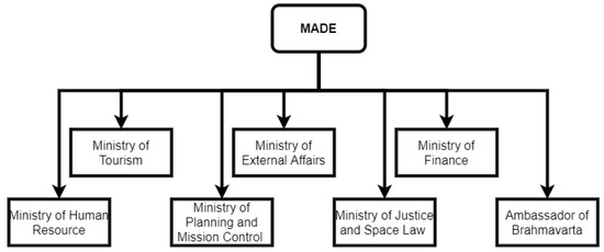 By the year 2024, MADE will come into existence when governments and space agencies will join hands to sign the Mars treaty and will become the investors in this project. The number of Brahmavartans and the authorities on MADE will be based on the investments, with the highest being the greatest number of Brahmavartans. MADE is split into six different ministries, with the Martian Ambassador overlooking the operations with a flat hierarchy, as shown in Figure 1. The head of each ministry will act as a board of directors in decisions. In the case of even votes, the Martian ambassador will have another vote to decide. The board of directors will be responsible for managing the functionality of sub-departments. Goods arriving from Brahmavarta will be handled by the Ministry of External Affairs in exchange for resources with governments on Earth. The Ministry of Finance will handle the investments and the budgets for funding missions and research projects on Mars. The Ministry of Human Resources and Development will look after the recruitment process and the training of the Brahmavartans. The Ministry of Tourism will take care of future tourists and their needs. The Ministry of Planning will build the infrastructure of MADE and take care of the mission control.