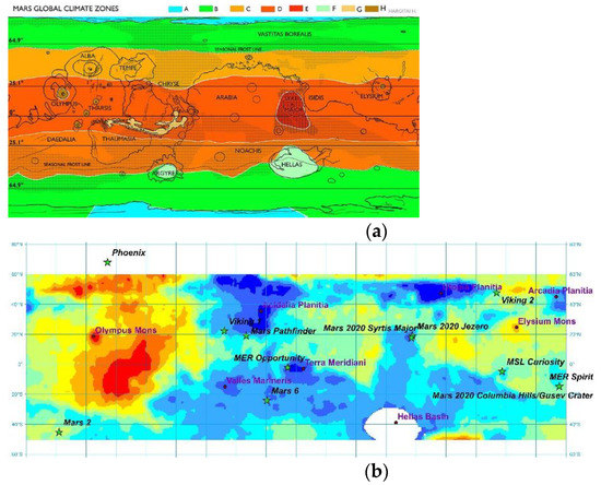 (a) Mars Global Climate Zones, (b) Map of the ideal sites from a plant perspective.