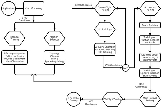 The training program for Brahmavartans on Earth will start in 2024. Approved space organizations and governments will have to apply, and at full capacity, 3750 trainees will be selected by MADE for each round. The selection will be based on resilience, adaptability, flexibility, the English language, medical history, age between 20–45, and no criminal background. Training will be given on Martian knowledge, software skills, and various group activities. At the end of the cut-off round, the trainee group will be left with 3350 trainees. At full capacity every year, six rounds of training will be considered, and 3350 trainees will go through basic and advanced Martian survival training, as shown in Figure 3. In the end, trainees will be offered to join MADE, for a better understanding of Martian governance. Basic level activities will include technical, physical, and social training. Every candidate will be trained with multiple skills, and points will be awarded to mark their progress. Therefore, the whole training program has been designed for 4 years.