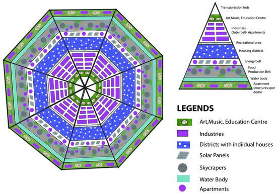 The total area of a sector is 16 km2. All measurements and calculations to build all the components of this sector were based on [23]. The layout of each sector is designed in an octagonal shape with eight layers, as represented in Figure 4. Each of these layers consists of an essential component required for the genesis and survival of a city and is described in order from the outermost to the innermost. The first layer of the city consists of apartments which consist of two-bedroom flats, as mentioned in Section 3.2.4. These apartments are placed at uniform intervals and are separated from the rest of the layers by a canal, which forms the second layer. The next layer is a necessity for the sustainability of the sector—the food production belt. This layer is interspersed with industrial buildings which are constructed in a manner as to expel the least amount of particulate matter to avoid pollution in the apartment zone. Half of the size of the food production belt is made up of structures to support vertical farming in artificial light [24]. The city state is equipped with a state-of-the-art hyperspectral imaging (HSI) sensor for detecting air pollution [25,26,27]. The next layer is the energy belt, which contains arrays of backup solar panels affixed to the ground to fulfill the emergency requirements of the sector, along with a few apartment buildings. Beyond this layer of energy generation is the layer which consists of districts with individual housing, which are single bedroom flats. These housings are structurally and aesthetically identical and are designed by the Green Building Construction concepts. The next layer consists of areas of recreation—theaters, pubs, gaming centers, aquariums, gymnasiums, and a multi-purpose sports stadium. They are placed strategically close to the individual housings to encourage congregating masses. Going further inside the sector, the next layer also houses industrial buildings manufacturing other essential requirements of the city. The outer edge of this layer consists of studio-type apartments where people working in the industries would live for emergencies. The studios are built in such a way that two studios can be combined into one, forming a double-bedroom apartment if necessary. The penultimate layer consists of buildings dedicated to the fine arts and educational institutions. It consists of research labs for various engineering and medical fields. The hospitals are equipped with the state-of-the-art biosensors and AI diagnostic abilities [28,29,30,31,32,33,34]. The Brahmavarta Congress is located at the central dome of the sector. The innermost layer also contains a transportation hub, where a public transport vehicle commences its journey before traveling throughout all the layers linearly and radially, plying across all the roads connecting the different layers of the sector. The black lines represent the roads. Amalgamating with another identical sector, the city is constructed.