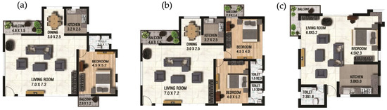 (a) A studio, (b) One Bedroom Apartment, (c) Two Bedroom Apartment.