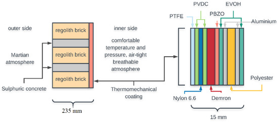 Transporting all the necessities for the infrastructure from Earth is not feasible. The regolith available on Mars is rich in oxides of iron, silicon, magnesium, and aluminum, which can be synthesized, and it is possible to extract essential materials for building infrastructure on Mars. With the abundance of CO2 in Mars’s atmosphere, polyethylene, polypropylene, and polycarbonate can be easily manufactured on Mars. A thermomechanical coating (TMC) can be extracted from Mars regolith, along with the bricks and sulfur-based concrete [37]. The thickness of the outside walls will be ~250 mm, of which 235 mm will be brick thickness, and the remaining will be TMC, which can be seen in Figure 6. TMC protects from excessively cold temperatures, impacts, fire, heat, wear, abrasion, chemical degradation, thermal conduction, and radiation heat losses and is also flexible enough to allow easy and repeatable folding and unfolding [5]. For the roof of the greenhouse and inner living quarters, polymethyl methacrylate glass will be used. PMMA is an economical alternative to polycarbonate when tensile strength, flexural strength, transparency, polishability, and UV tolerance are more important than impact strength, chemical resistance, and heat resistance. By extracting and synthesizing the Martian Regolith, the PMMA glass can be manufactured. In addition, PMMA glass provides protection from UV radiation for wavelengths around 300 nm, which is within the range in the case of Mars [38]. Apart from the manufacturing of primary materials, ethylene can also be used for the manufacturing of thermoplastic elastomers, which is the primary material for space suits [39]. Carbon, nickel, manganese, aluminum, steel, and other metals required for manufacturing colony equipment can also be extracted and processed [40]. It is to be noted that the buildings as well as the outer shell of the city will be constructed based on these layers.