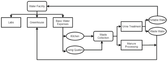 A healthy body requires 2 kg of food every day for nutrition and energy, which includes 1000 mg of calcium, 400 μg of folic acid, and 56 g of protein each day. However, the intake varies, with scenarios such as the iron intake for females being double, while the whole intake doubles in case of pregnancies. Considering these factors, poppy seeds, winged and soya beans, lentils, potatoes, tomatoes, onions, green beans, spinach, beets, orange, and lemons will be harvested. In addition, every year, a cargo consisting of 100 tons of meat will be imported from Earth to Brahmavarta. These crops require only 7 h of sunlight and 14 h of artificial light, manure, and a proper drainage system. These plants only require a sprinkling of water from time to time. Soil is required to be rich in potassium, phosphorous, and nitrogen nutrients, which can be easily achieved by adding composites, lime, and sulfur to maintain the pH balance for the respective crops. Rhizobium bacteria will be used to make nitrogenous-rich soil [59]. For the first two years, 100 kg of manure will be imported from the Earth, which costs $1000 for a ton, and simultaneously, the Martian soil will be prepared. The food for the first year will be brought by the Brahmavartans in their cargo. The layout of the water processing and the manure processing is represented in Figure 8. Water treatment facilities will purify urine into struvite, a very good fertilizer that is guaranteed to be free from diseases. Human waste will be collected and sent for the processing which will be used as manure for agriculture along with struvite. It has also been found that the holes that worms dig in the soil aerate the mixture and improve the soil’s structure, making it easier for water to penetrate the soil and nourish plants. Through their activity in the soil, earthworms offer many benefits: increased nutrient availability, better drainage, and a more stable soil structure, all of which help improve farm productivity. It has been found that earthworms not only can survive but also reproduce in Martian soil, which can be used to aerate and improve the soil structure [60].