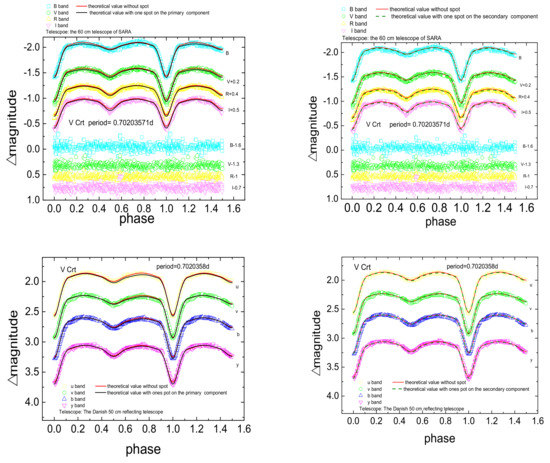We used the updated 2014 Wilson-Devinney program [128,129,130,131] to revise the orbital parameters of the eclipsing binaries. The Wilson-Devinney program is the most widely used for light curve modeling code to obtain the stellar and starspot parameters of eclipsing binary. This program uses a different correction method for parameter adjustment of the observed light and velocity curves by the lease squares criterion, and produced the corresponding theoretical curves. We set V Crt as a semi-detached binary in the WD program according to previous research [11]. We set 7500 K for the primary component, 5000 K for the secondary component, a mass ratio of the secondary component and primary component (q) of 0.683 as the initial value. Further, we also set the bolometric albedo coefficient = = 0.5 [132] and gravity-darkening coefficients = = 0.32 [133]. The bolometric limb-darkening coefficients and limb-darkening coefficients for the four BVRI bands are = 0.469, = 0.429; = 0.558, = 0.864, = 0.471, = 0.725, = 0.375, = 0.599, = 0.294, = 0.489, respectively based on the stellar temperature [134]. We attempted the calculation using several sets of mass ratios to obtain the best rate if the mass ratio was unknown. The temperature was obtained using J-H color index relation [135] or spectral type. We simultaneously adjusted with other parameters: orbital inclination (i), temperature of secondary component (), monochromatic luminosity of the primary component (, , and ), and dimensionless potentials of the two components ( and ). We adjusted each parameters for converge to obtain the best solution by several steps. We used the weighted sum of squares of the residual between the theoretical and observed light curves to judge the best results.