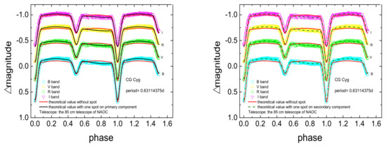 The theoretical and observational light curves of CG Cyg, where the left panel shows the model with a spot on the primary component, and the right panel shows the model with spot on the secondary component.