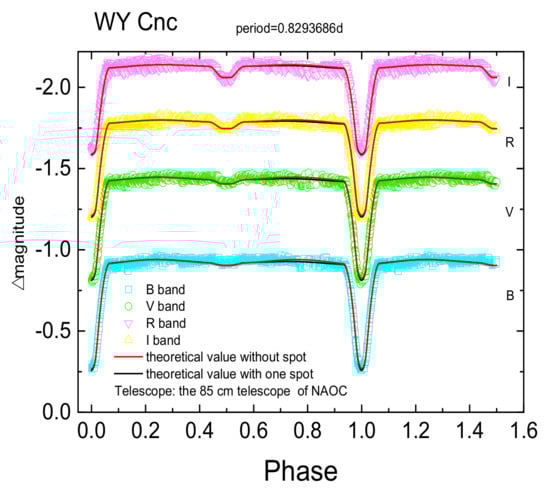 where G is the gravitational constant. We calculated J as , which is similar to the result reported by Chen [37]. The period change of WY Cnc may be caused by the magnetic braking effect [37].