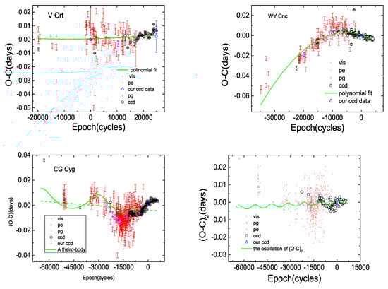 The fit of the minima times of eclipsing binaries, where the upper-left panel is the polynomial fit of V Crt, and the upper right panel is the polynomial fit of WY Cnc. The bottom left is the fit of third-body of CG Cyg, and the bottom right is the fit of (O-C) II of CG Cyg.