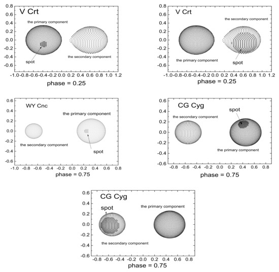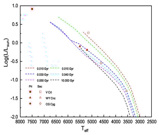 In Figure 9, we plotted the vs. diagrams with many theoretical isochrone [143], and indicated the positions of both primary and second components of V Crt, WY Cnc and CG Cyg. We found that the parameters of the primary and secondary components of WY Cnc and CG Cyg are in agreement with the 0.030 Gyr tracks of the theoretical model. The secondary component of V Crt are in the region of 0.03–0.05 Gyr. Because V Crt is a semi-detached eclipsing binary and the primary component of V Crt is approximately 7500 K, it is difficult to determine its age. However, its age can be determined by investigating additional observations and theoretical models.