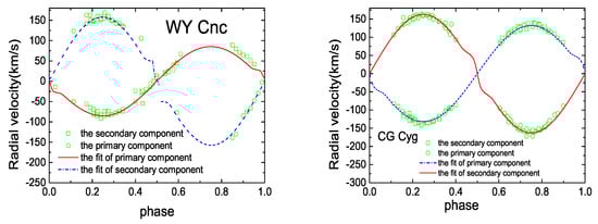Theoretical and observational radial velocity curves, where the left panel is the radial velocity of WY Cnc, and right is CG Cyg.