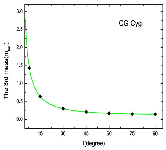 The value of the third body was smallest when i = 90, as illustrated in Figure 8. Therefore, we obtained the minimum mass of as 0.14 M, which is close to the result of 0.12 M [55]. The parameters of the periodic oscillation are listed in Table 7.