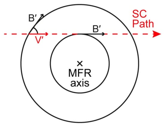 The schematic view of the magnetic flux rope (MFR) cross section (adapted from the paper by Zhang et al. [31]). The relative arrangement of components of the local magnetic field and spacecraft velocity perpendicular to the MFR axis orientation is shown.