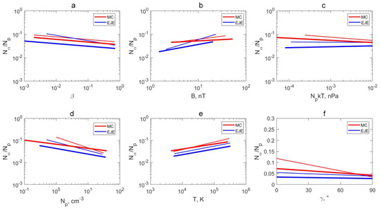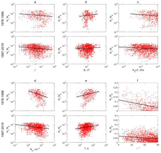 Black straight lines are approximations of the dependences. Similar to the paper [28], a logarithmic scale is used in panels a–e. This allows us to display a wide range of variables on the X-axis (for example, the proton temperature). The dependences represented on these panels were approximated by power functions, which gave straight lines on the corresponding panels. Since the angle γ takes values from 0° to 90°, the dependence of Nα/Np on γ is shown on a linear scale for greater clarity. Approximation of this dependence was carried out using a polynomial of the first degree.