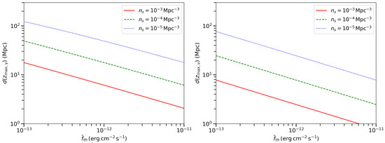 The horizon distance as a function of telescope sensitivities. Left panel: observation of >2 TeV gamma-rays. Right panel: observation of >100 TeV neutrinos. The three lines from top to bottom correspond to three source number densities, , , and .