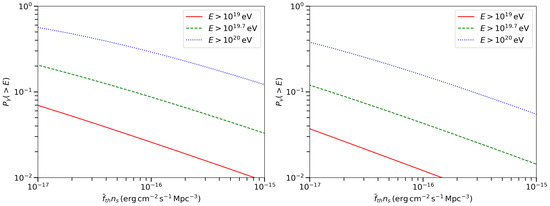 With the horizons derived, the probability of source detection per UHECR can be calculated. Three parameters determine the detection probability: the sensitivity, source number density and the lower limit of cosmic ray energy. The first two parameters affect the horizon together by their product, , because the maximum redshift can be seperated from and in Equations (3) and (4). The dependence of the detection probability on the product, , is shown in Figure 2. A larger source number density leads to lower luminosity, and then smaller detection probability. A better gamma-ray or neutrino telescope sensitivity surely leads to a higher probability.