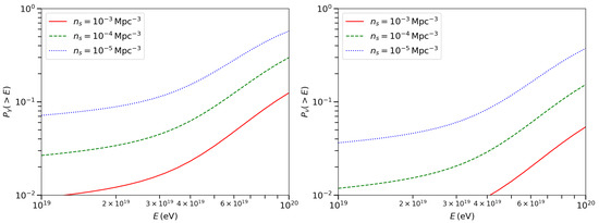 The model can be used for both steady sources and transient sources of UHECRs. For steady sources, the source number density in our model and calculation just means their number density. For example, starbusrt galaxies are one kind of potential sources for UHECRs [28]. Number density of starburst galaxies is about , and they can be seen as steady sources. When the gamma-ray telescope sensitivity is , we have probability to find gamma-ray source at direction of a UHECR with energy , if source number density is at a level of that for starburst galaxies. For transient sources, gamma-ray and neutrino emission from their host galaxies still last ∼. The production, , is an average number density for transient sources. But these transient events often occur repeatedly in their host galaxies, and we consider the host galaxies as the gamma-ray and neutrino sources. To get the number density of host galaxies, the average number density of the sources should multiply a factor , where is the typical time interval between two transient events. So we can use ∼ as the source number density for transient sources. Gamma-ray bursts (GRBs) are candidate sources for UHECRs [20,29,30], and they are transient events. Event rate of GRB is about ∼∼, if we consider the beaming effect. When we take the time interval ∼, we get source number density for GRBs is ∼. For source number density at this level, an UHECR sample with energy above is needed to get a detection probability.