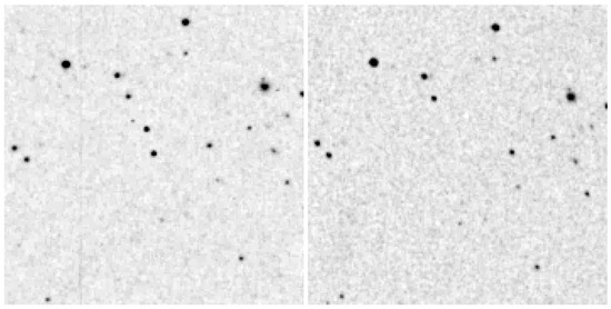 - Removal of USNO sources lying on the vicinity of bright stars: Diffraction spikes are lines radiating from the centers of bright astronomical sources. These features are generated when the incoming light is diffracted by the structure which upholds the secondary mirror in reflecting telescopes. To identify and remove the sources of the sample of 150,000 candidates associated with diffraction spikes, we visually inspected several hundred images to find the distribution pattern of these spurious sources in terms of the apparent magnitude of the bright star and the distance to it. The visual analysis led to the definition of a bright star as an object fulfilling the following two heuristic criteria (Figure 2), see Solano et al. (2022) [25] for details: