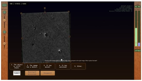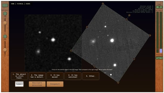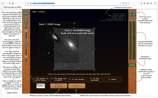 The citizen science project is accessed through the VASCO web interface [22]. The VASCO web interface differs from the usual Zooniverse web interface in that each “mission” takes longer to fulfill and has more steps. A bigger emphasis has also been put on the playability aspect of the interface to enhance the entertainment factor [22].