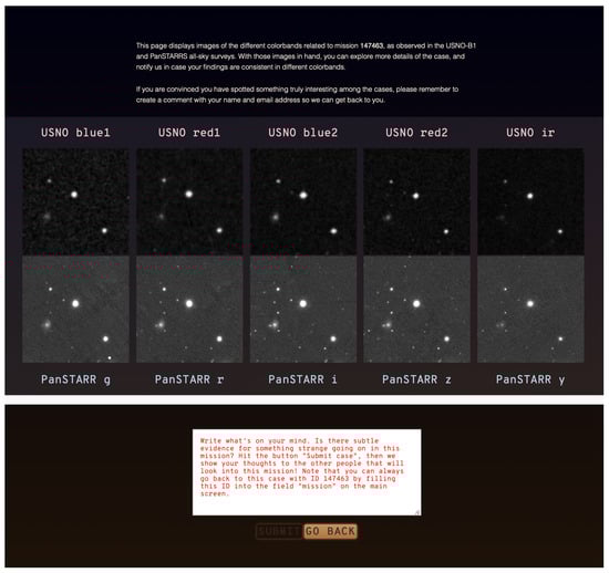 Each user can decide how deep they wish to study each candidate. The web interface presents the user with a random pair of images, where the left shows an old image and the right, a new image. Old blue are compared with modern blue images, and old red with modern red images. Every time a new pair is shown, the system randomizes which color band that is displayed. The old and new images have different photometric depths, which the user is asked to take into consideration. In the current implementation, the old images are taken from the POSS surveys and the new images from Pan-STARRS, in order to study the candidates identified by Villarroel et al. (2020) [20]. A user is asked to investigate the images in several different steps: