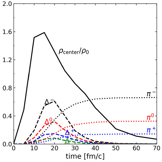 Under the mean-field potentials, each baryon species is affected by different vector potentials, because nucleons and baryons have different isospin values and electric charges. In the absence of the mean-field potentials, baryons propagate in the phase space in only the coordinate space unless a collision occurs. However, under the mean-field potentials, the time evolution of the phase-space functions of baryons are governed by Equation (21). In this case, both the spatial and momentum coordinates change. For pions, because they are treated as free particles, and the only way to change their momentum is a collision regardless of the existence of mean fields. We take the number of test particles , the time interval fm/c in all calculations to reduce spurious collisions or decays, and 40 independent runs for a better statistics. The density distributions from relativistic Thomas–Fermi calculations are used for initializing the projectile and the target nuclei.
