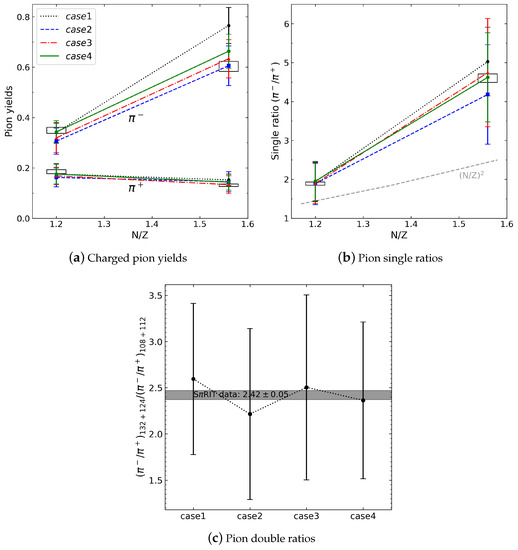 (a) Charged pion multiplicities as a function of for neutron-poor () systems and neutron-rich () systems. Upper (lower) four lines are for (). We consider four difference cases as given in Table 3. (b) Charged pion single ratios as a function of for four cases. All the empty boxes in (a,b) are experimental data with uncertainties. (c) Double ratios for Sn+Sn and Sn+Sn for four different cases. Experimental data are marked as a gray box. Note that the statistical errors are quite large because the number of produced pions per run is very small.