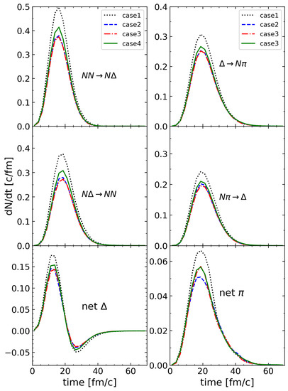 In the previous studies [36,37] with no , C was taken to lie between 1.65 and 1.9 in order to compare pion-related quantities with the FOPI experiment data. The isospindependent parameters , , and correspond to the , , and channels, respectively. For the asymmetric collisions with a high ratio, these factors will give strong constraints to the pion productions. The cross sections for the inverse reactions also have density and isospin dependences as in Equation (17).