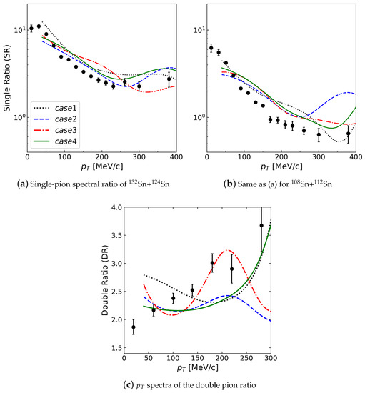 (a) Single-pion ratio as a function of transverse momentum for neutron-rich system with (Sn+Sn). (b) The same for a neutron-deficient system with (Sn+Sn). (c) Transverse momentum spectra of the double ratio of two Sn collision systems, Equation (22). Circle markers with uncertainties are experiment data taken from Ref. [40] and the curves are the ratios corresponding to four different parameter sets.