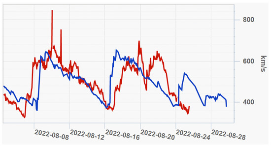 The picture represents measured (blue line) and on-line forecasted by the QSW model (red line) velocities of the SW at the L1 Sun-Earth point from page at the SINP MSU site (https://swx.sinp.msu.ru/weather.php?lang=en (accessed on 25 August 2022)).