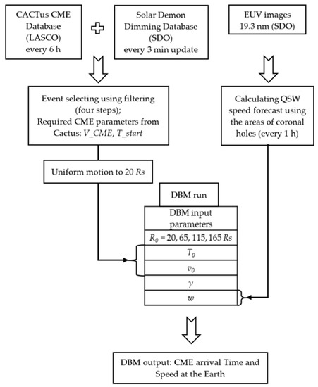 The whole SMDC forecasting process is shown at the Figure 2. All necessary data are updated every day: the CACTus database has a quick look catalogue that is updated every 6 h, the Solar Demon Database also has the quick look page that is updated every 3 min. Thus, our selection method is available to run every 6 h to search for potentially significant CMEs. The startup CME time and speed are taken from the CACTus database after four-step filtering. Then, the initial parameters for DBM at 20 solar radii are determined in assumption of the uniform CME motion. The ambient SW speed w is calculated according to the QSW model taking the minimum value of 300 km s−1 in the cases where no CHs are present at the solar disc.