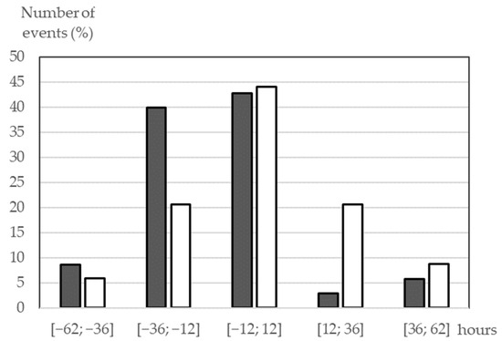 Distributions of the ICME arrival time errors for the events of 2015–2017 predicted by SMDC (the white bars) and CCMC Scoreboard (the gray bars). The y-axis shows the percentage of the observed hit events depending on the time error within the interval in hours marked on the x-axis.