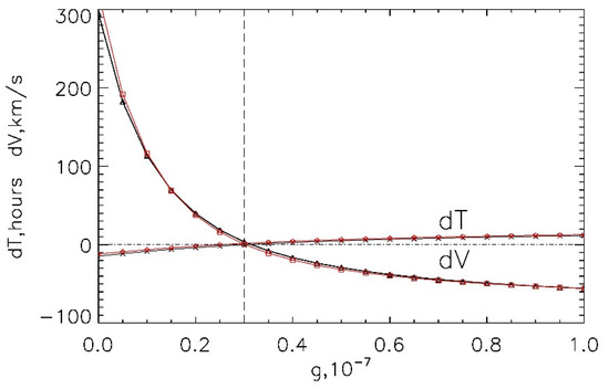 To determine the optimal γ-value, we fulfilled calculations with γ changing from 0 to 1 × 10−7 km−1 in 0.05 × 10−7 steps. Thus, for each γ-value we obtained the modeled arrival times and speeds for all selected ICMEs, which then we compared with the start time and average speed of the primary ICMEs indicated in the R&C list. Figure 4 shows the dependence of averaged (over all set of ICMEs) mean difference in time (dT) and speed (dV) between the modeled and measured values as a function of γ.