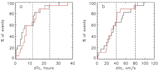 Probabilities of the ICME forecast obtained with the ensemble model for γopt = 0.3 × 10−7 km−1 as a function of the confidence intervals: (a) for the values |dT|≤ dTc, (b) for |dV|≤ dVc. The black lines correspond to the initial CACTus data, the red lines—to the CDAW data. The dashed lines show the limits of the confidence intervals according to Table 8.