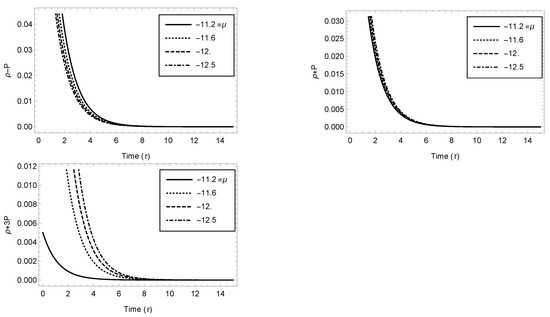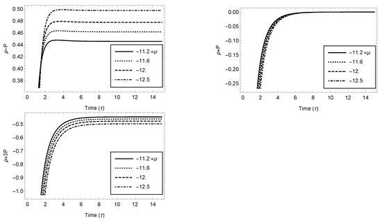 We can explore various energy conditions, i.e., the null energy condition (NEC), , dominant energy condition (DEC), , weak energy condition (WEC) , and strong energy condition (SEC) from Figure 1, Figure 2, Figure 3 and Figure 4. Here, the NEC represents the attractive nature of gravity, which is true in Case 3.1, whereas it is violated in Case 3.3. According to the DEC, in Cases 3.1 and 3.3, the mass–energy parameter cannot be seen moving faster than light. The WEC is true in Case 3.1 and Case 3.3, which show that that the matter density observed by the respective observers is always positive. In Case 3.1, the SEC is satisfied, while t is violated in Case 3.3.