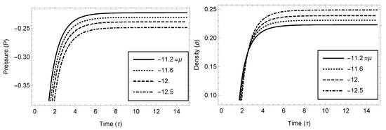Variation of the pressure and density w.r.t. time (Case 3.1). Here, we considered the following parametric values: , , and , which will also be followed in all other plots.