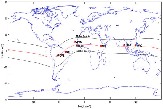 In the present study, we considered the GPS observation data in Receiver Independence Exchange (RINEX) format from three different longitudinal regions, namely, American (Sao Luis, Brazil (SALU) and Porto Velho, Brazil (POVE)), African (Cape Verde (CPVG) and Addis Ababa University, Ethiopia (ADIS)), and Asian (Hutbay, Nicobar Islands (HUTB) and Puerto Princesa, Phillipines (PPPC)) longitudes, when extracting the ionospheric TEC at the respective locations. The geographic coordinates, as well as geomagnetic latitudes, of individual stations are listed in Table 1. The 30-second sampling GPS observation data from the three longitudinal sectors were downloaded from the UNAVCO archives (https://data.unavco.org/archive/gnss/rinex/obs/; accessed on 25 October 2021). Figure 1 shows the exact location of the stations used in this research, while Table 1 shows their geographic coordinates and magnetic latitudes, as well as the full meaning of all the GPS observation station codes. Further, the TEC values at corresponding locations predicted by the IRI were obtained by executing the instant run version of the IRI-2016 model (https://ccmc.gsfc.nasa.gov/modelweb/models/iri2016_vitmo.php; accessed on 19 November 2021). The TEC values were also extracted from the hourly GIMs developed by the Center for Orbit Determination in Europe (CODE) at the University of Bern by adopting a four-point inverse distance weighted interpolation technique []. The CODE GIMs are available in the IONosphere map EXchange (IONEX) format, with the global map represented in the form of grids having a spatial resolution of 2.5° in latitude, a spatial resolution of 5° in longitude, and a temporal resolution of 1 h (25 maps per day). The corresponding GIM TEC at the GPS station locations in the grids can be extracted by interpolating the values from the four nearest grid points’ vertexes. The CODE GIMs were accessed from the CDDIS-NASA server (https://cddis.nasa.gov/archive/gnss/products/ionex/; accessed on 16 December 2021).