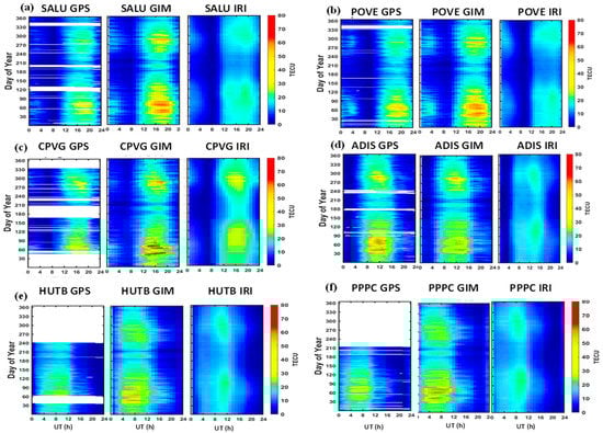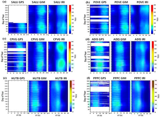 Finally, for the minimum phase year of 2019 (Figure 5a–e)) at the three longitudes used in this research, the GPS-TEC, GIM and IRI-2016 model values were seen to further reduce than the previous minimum phase year (i.e., 2018). The diurnal variations in the GPS-TEC, GIM and IRI-2016 models were very similar to the diurnal variations of the minimum phase year of 2018, though with slightly lower values. Unfortunately, there were no GPS-TEC observation values at SALU in the American longitude and HUTB in the Asian longitude, which made it difficult to evaluate the assessment of the GIM and IRI-2016 models on GPS-TEC. At POVE (Figure 5b) in the American longitude, the GPS-TEC, GIM and IRI-2016 models showed similar diurnal profiles, but the GIM showed slightly higher maximum values (~18–21 TECU) than GPS-TEC (~14–16 TECU) and IRI-2016 (~11–13 TECU). In the African longitude (Figure 5c,d), the GPS-TEC, GIM and IRI-2016 models showed similar diurnal trends, but at CPVG (Figure 5c), the IRI-2016 model was observed to show slightly higher maximum values (~22–28 TECU) than GPS-TEC values (~18 TECU) and GIM (~20 TECU). At ADIS (Figure 5d), GPS-TEC was observed to show the highest magnitude, followed by GIM, while the IRI-2016 model showed the least magnitude. Lastly, in the Asian longitude, GPS-TEC and GIM at PPPC (Figure 5f) were observed to show similar diurnal patterns that were slightly different than that of the IRI-2016 model. At PPPC, the diurnal magnitudes of the GPS-TEC, GIM and IRI-2016 models were less than 18 TECU from pre-sunrise to noon-time with respect to UT. However, at HUTB (Figure 5e), the values of the GIM and IRI-2016 models were shown to potentially be suitable to estimate the values of GPS-TEC, especially during the minimum phase, according to the consistent trend observed in this study.